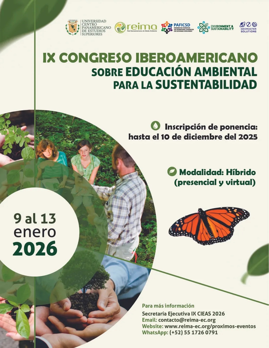 La Universidad Centro Panamericano de Estudios Superiores (UNICEPES), la Red Iberoamericana de Medio Ambiente (REIMA, A.C.) y la Pan American Foundation for International Cooperation for Sustainable Development (PAFICSD), con el apoyo de Geomaster Solutions y Environment & Sustainability LLC te invitan a participar como ponente en el IX Congreso Iberoamericano sobre Educación Ambiental para la Sustentabilidad (IX CIEAS - UNICEPES 2026), que tendrá lugar de manera híbrida del 9 al 13 de enero de 2026.