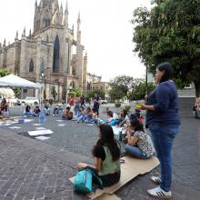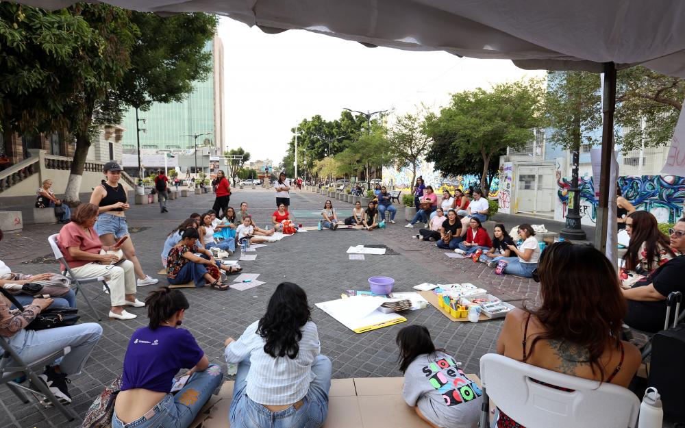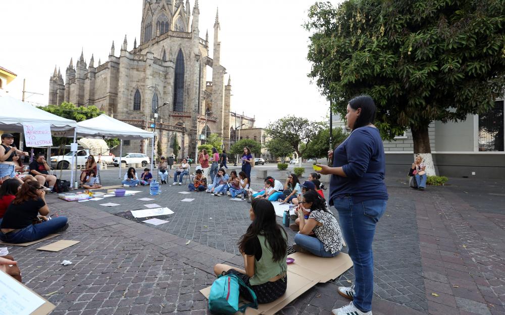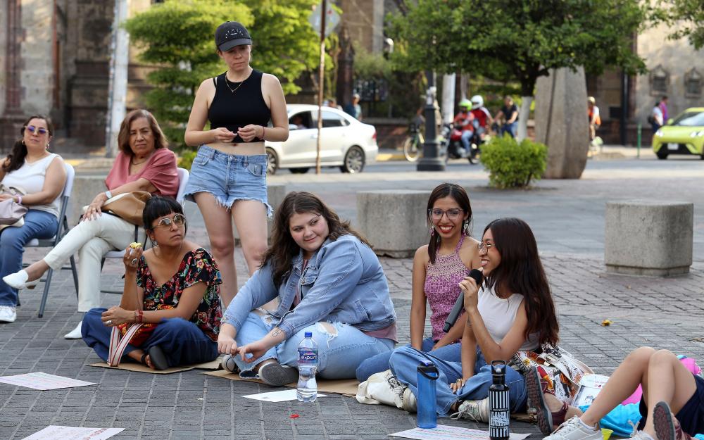 Integrantes de la colectiva “Desayuno feminista”, en conjunto con el Centro de Estudios de Género del Centro Universitario de Ciencias Sociales y Humanidades (CUCSH), el Sistema de Educación Media Superior (SEMS) de la UdeG, y la asociación civil Federación de Mujeres Universitarias, entre otras instancias, llevaron a cabo el círculo de reflexión feminista en torno a la menstruación y menopausia libre de tabú, en la Rambla Cataluña.