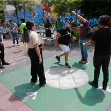 Mauricio Zamudio Ortega, estudiante de último semestre de la licenciatura en Matemáticas y tallerista de “Matemáticas en la calle”, con una soga pretendió que los participantes utilizaran la lógica y el razonamiento para poder hacer y deshacer nudos que mantenían atrapados a los jugadores.