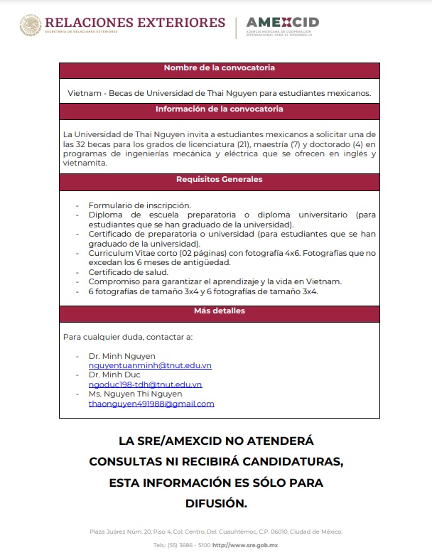 La convocatoria Vietnam - Becas de Universidad de Thai Nguyen para estudiantes mexicanos invita a estudiantes mexicanos a solicitar una de las 32 becas para los grados de licenciatura (21), maestría (7) y doctorado (4) en programas de ingenierías mecánica y eléctrica que se ofrecen en inglés y vietnamita.