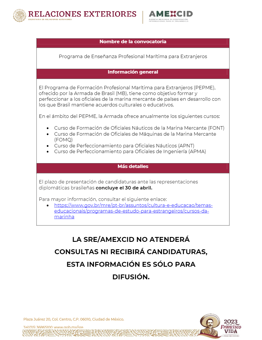 Fecha límite de envío de solicitudes: 30 de abril de 2023, 12:00 hrs -mediodía- (hora Madrid), 04:00 hrs (hora CDMX)