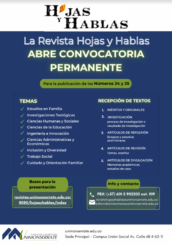 La presente convocatoria tiene por objeto difundir artículos que abarquen elementos de disertación y análisis en los campos transdisciplinares de los estudios en familias, investigaciones teológicas, ciencias humanas y sociales, ciencias de la educación, ciencias de la ingeniería, y ciencias administrativas y económicas.
