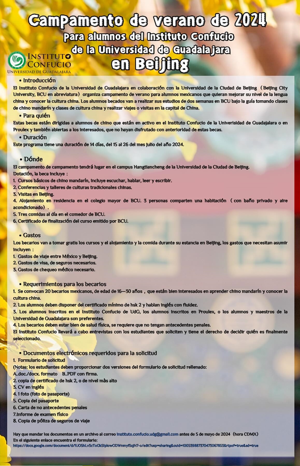 El Instituto Confucio de la Universidad de Guadalajara en colaboración con la Universidad de la Ciudad de Beijing (Beijing City University -BCU-) organiza campamento de verano para alumnos mexicanos que quieran mejorar su nivel de la lengua china y conocer la cultura china.