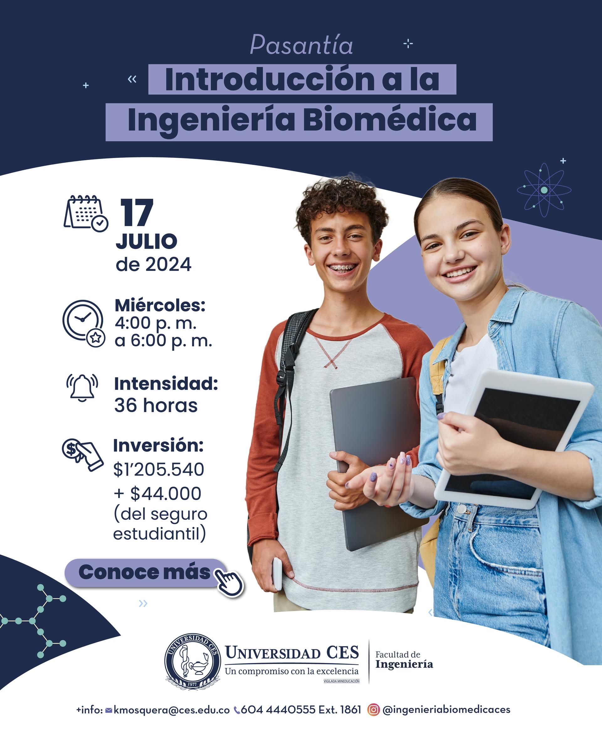 La pasantía busca apoyar la decisión de carrera en los estudiantes de colegio al permitir que participen de una asignatura de la malla de ingeniería biomédica, lo que permite afianzar su vocación y compartir espacios de la Universidad con estudiantes y con personal de la misma. No se requiere experiencia previa en ingeniería biomédica, ¡solo una mente curiosa y muchas ganas de aprender! ¡Inscríbete ahora y sé parte de esta emocionante aventura en el mundo de la ingeniería y la medicina!