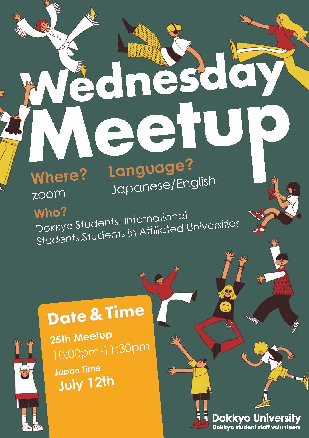 ¡Dokkyo University, de Japón, te invita al “Wednesday Meetup”, un evento de intercambio internacional dirigido por estudiantes, se llevará a cabo en Zoom el 24 de mayo, 21 de junio, 12 de julio y 16 de agosto! De acuerdo a los comentarios de los participantes, se ha decidido realizar las reuniones de este semestre los viernes en lugar de los miércoles. Si deseas conversar sobre tus intereses, hacer nuevos amigos o mejorar tus habilidades lingüísticas, únete en este evento.