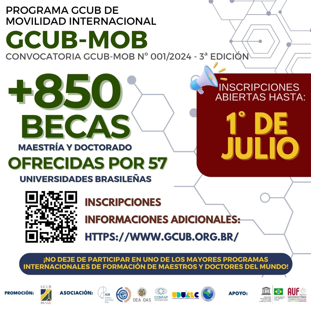 El Grupo de Cooperación Internacional de Universidades Brasileñas – GCUB se complace en anunciar la Tercera Edición del Programa de Movilidad Internacional GCUB – GCUB-Mob. En esta edición, más de 850 becas de Maestría y Doctorado serán ofrecidas por 57 universidades brasileñas, cuyos programas comenzarán en 2025.