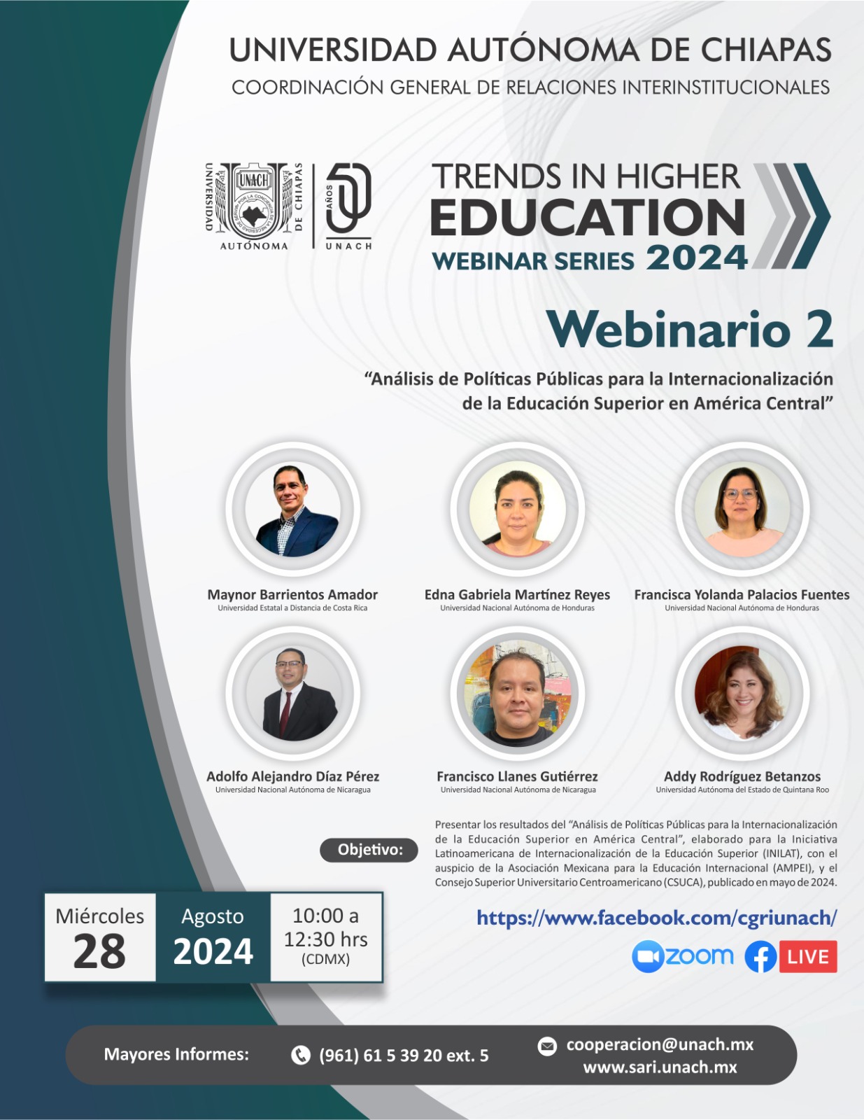 La Coordinación General de Relaciones interinstitucionales, de la Universidad Autónoma de Chiapas, te invita al segundo Webinario sobre Tendencias de la Educación Superior 2024: "Análisis de políticas públicas para la internacionalización de la Educación Superior en América Central".