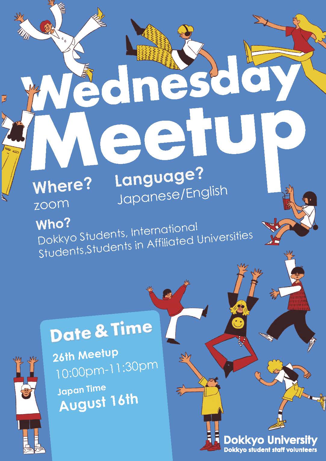 ¡Dokkyo University, de Japón, te invita al “Wednesday Meetup”, un evento de intercambio internacional dirigido por estudiantes, se llevará a cabo en Zoom el 24 de mayo, 21 de junio, 12 de julio y 16 de agosto! De acuerdo a los comentarios de los participantes, se ha decidido realizar las reuniones de este semestre los viernes en lugar de los miércoles. Si deseas conversar sobre tus intereses, hacer nuevos amigos o mejorar tus habilidades lingüísticas, únete en este evento.