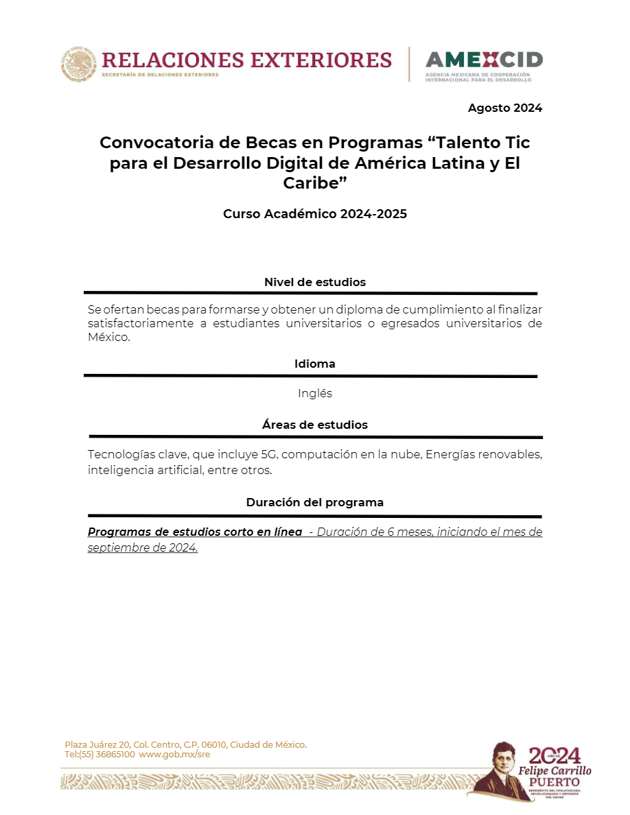 Se ofertan becas para formarse y obtener un diploma de cumplimiento al finalizar satisfactoriamente a estudiantes universitarios o egresados universitarios de México. El Gobierno de Honduras en conjunto con la empresa HUAWEI, formará y entregara un diploma de cumplimiento al finalizar satisfactoriamente los cursos virtuales de nivel básico y avanzado, sobre tecnologías clave, que incluyen 5G, computación en la nube, energía renovable, inteligencia artificial, entre otros.