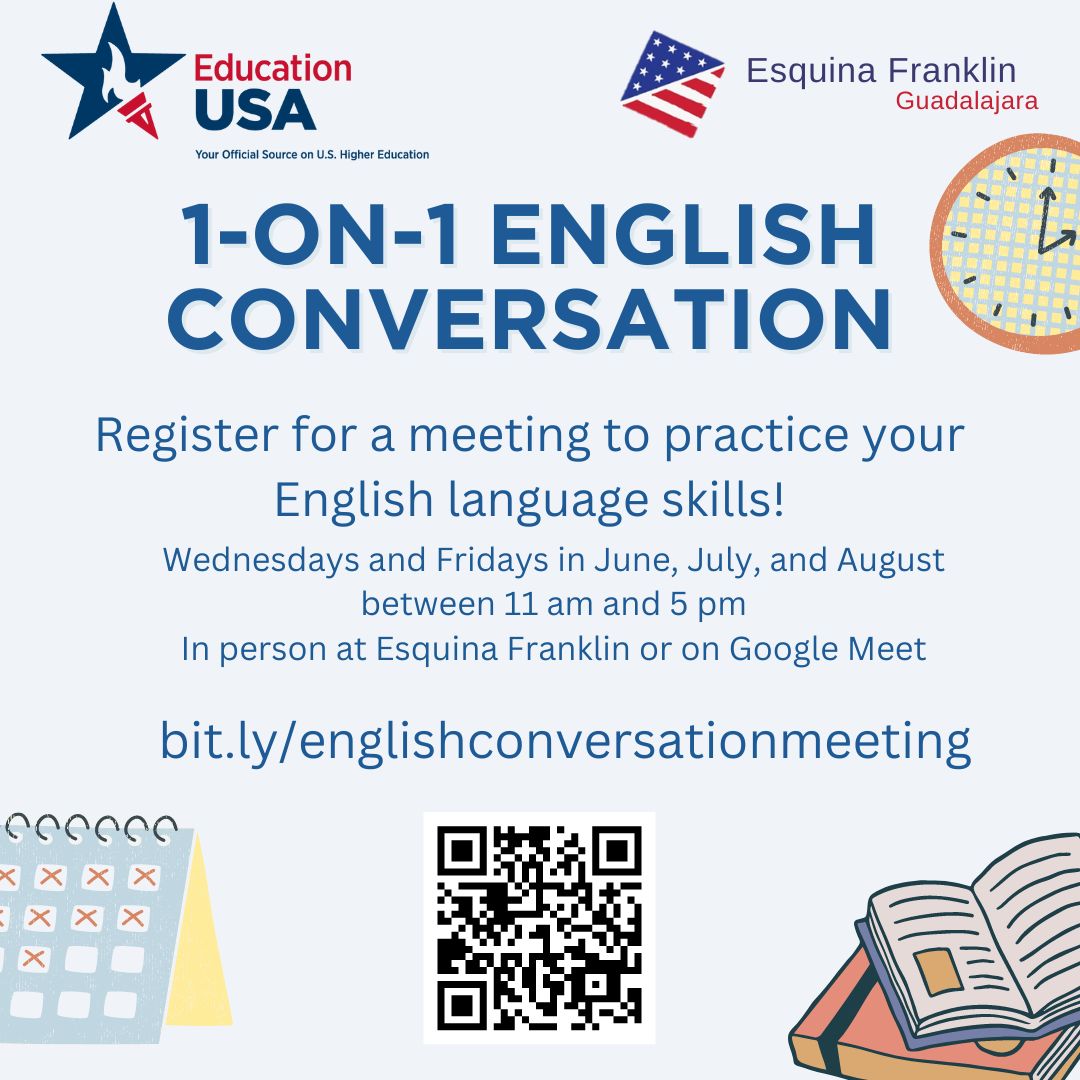 Solicita una reunión de 25 minutos, ya sea en persona o virtualmente, donde podrás practicar y mejorar tus habilidades en el idioma inglés a través de la conversación. Estas sesiones son gratuitas y se llevarán a cabo los miércoles y viernes de junio, julio y agosto ¡aparta una sesión porque son limitadas!