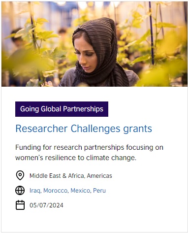 British Council ofrece estas subvenciones de hasta £30,000 para la cooperación entre Instituciones de Educación Superior (IES) de México y del Reino Unido que favorezca a la educación continua de grupos de investigación bilaterales con un enfoque en la resiliencia de las mujeres al cambio climático.