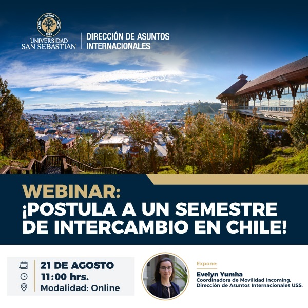 La Universidad San Sebastián (USS), de Chile, invita estudiantes de universidades socias a informarse sobre el proceso de postulación para realizar un semestre de intercambio académico en sus sedes de Santiago, Concepción, Valdivia y Puerto Montt (Patagonia).