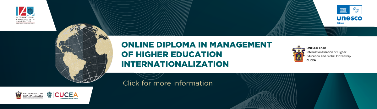 La Cátedra UNESCO “Internacionalización de la Educación Superior y Ciudadanía Global” de la Universidad de Guadalajara conjuntamente con la Asociación Internacional de Universidades ofrecen el diploma en línea “Gestión de la Internacionalización de la Educación Superior”; diseñado con cursos de tronco común para todas las regiones del mundo y con cursos especificos sobre el contexto regional de las instituciones de educación superior de América Latina y el Caribe; África Subsahariana; Medio Oriente y Norte de África y países del Golfo.