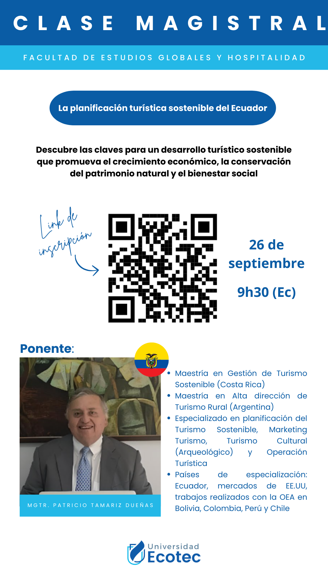 La Universidad ECOTEC a través de la Dirección de Internacionalización, te invita a esta clase en línea que estará a cargo del experto en el área el Mgtr. Patricio Tamariz y abordará temas clave sobre el desarrollo de prácticas sostenibles en la planificación turística de Ecuador.