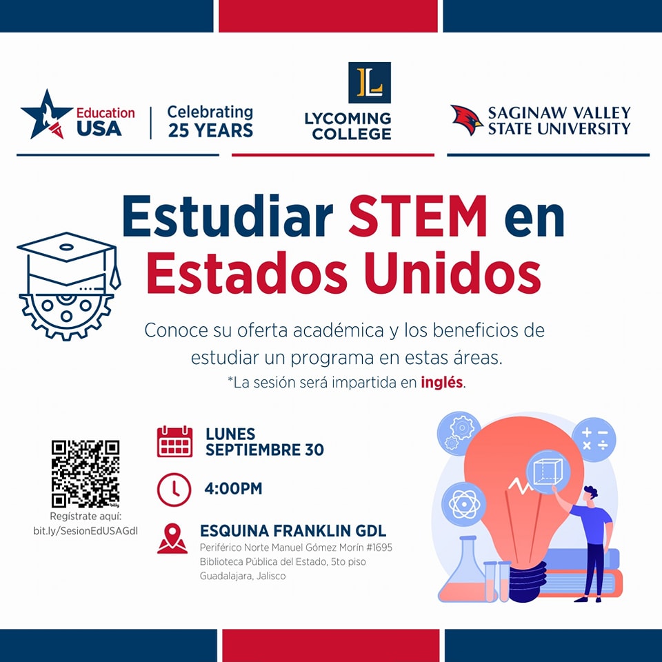 ¿Te interesa estudiar una licenciatura o posgrado en las áreas de Ciencia, Tecnología, Ingeniería y Matemáticas? No te pierdas la oportunidad de conocer a representantes de Lycoming College y Saginaw Valley State University y escuchar sobre sus ofertas educativas.