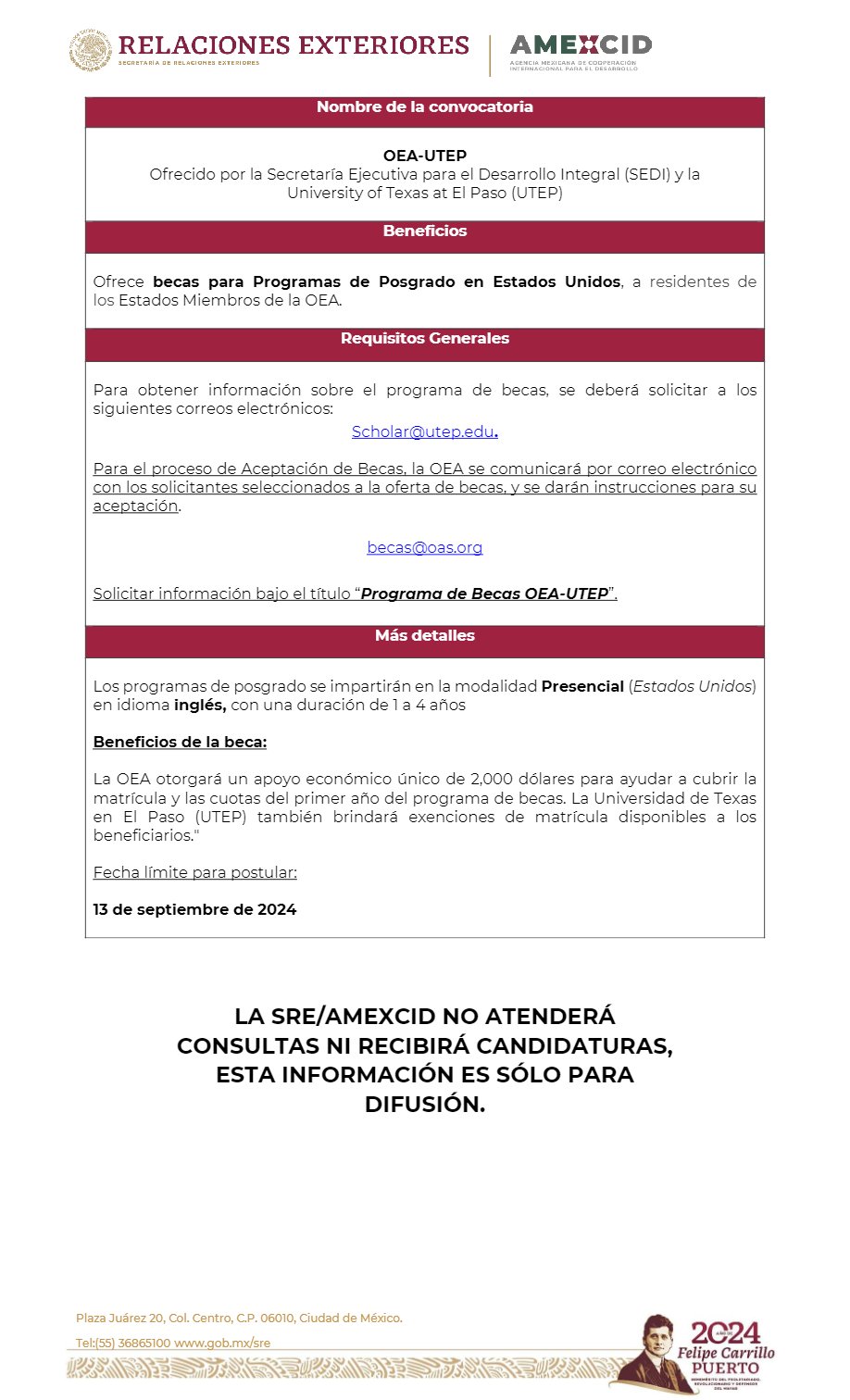 La Organización de los Estados Americanos (OEA) a través de la Secretaría Ejecutiva para el Desarrollo Integral (SEDI) y University of Texas at El Paso (UTEP), ofrecen becas para Programas de Posgrado en Estados Unidos, a residentes de los Estados Miembros de la OEA.