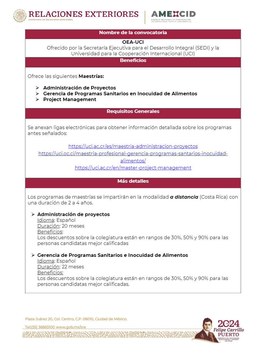 La Organización de los Estados Americanos (OEA) a través de la Secretaría Ejecutiva para el Desarrollo Integral (SEDI) y la Universidad para la Cooperación Internacional (UCI), de Costa Rica, ofrecen becas para Programas de Maestría en la UCI, a residentes de los Estados Miembros de la OEA.