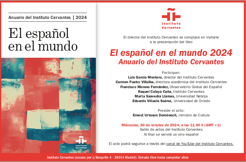 El Instituto Cervantes se complace en invitar a la presentación del libro El español en el mundo 2024. Anuario del Instituto Cervantes, que se celebrará el miércoles 30 de octubre, a las 11:00 hrs en el salón de actos del Instituto Cervantes (acceso c/Barquillo, 4).