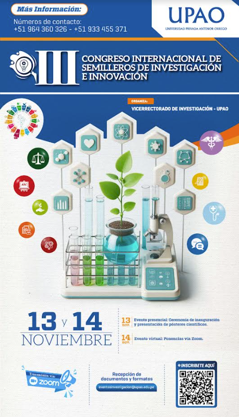 La Universidad Privada Antenor Orrego de Trujillo (UPAO), de Perú, convoca e invita a estudiantes miembros de Semilleros de Investigación e Innovación y a docentes investigadores de universidades e institutos educativos de nivel superior de países de habla hispana a participar en este congreso, modalidad semipresencial. Este evento ofrecerá la oportunidad de presentar y sustentar sus trabajos de investigación. El congreso es organizado por la UPAO y se llevará a cabo los días 13 (evento presencial) y 14 de noviembre (evento virtual) del 2024.