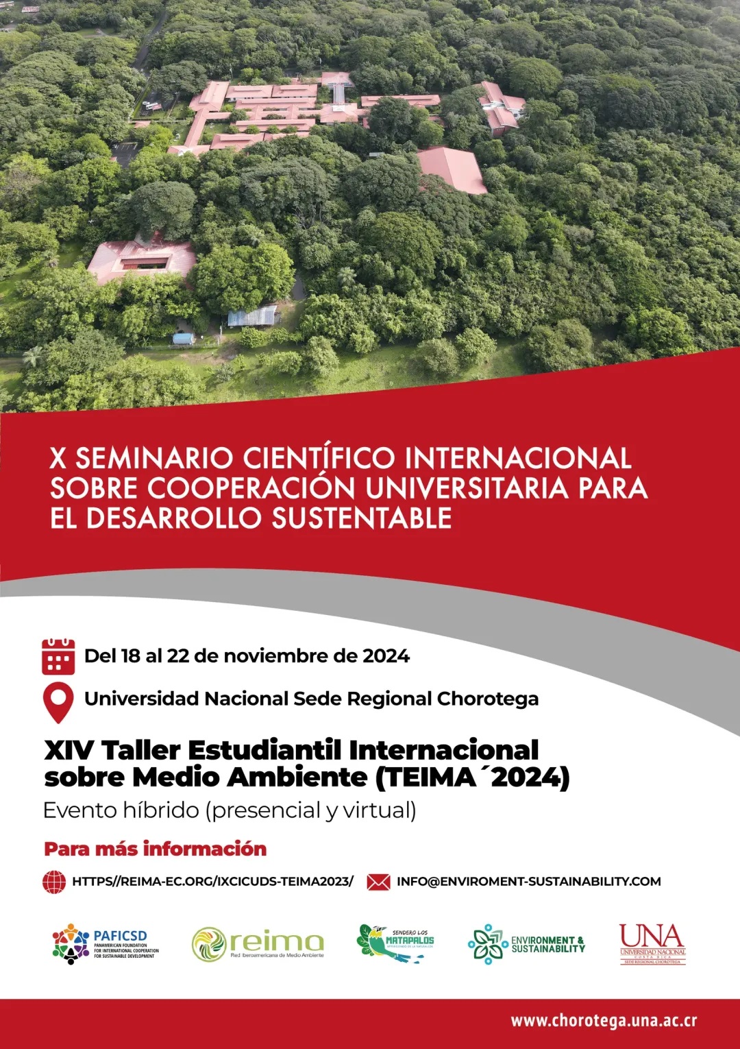 La Universidad Nacional (UNA) de Costa Rica, la Red Iberoamericana de Medio Ambiente (REIMA, A.C.) de Ecuador y la Pan American Foundation for International Cooperation for Sustainable Development (PAFICSD) de Canadá; con el apoyo de la Universidad Centro Panamericano de Estudios Superiores (UNICEPES) de México, Geomaster Solutions de Ecuador y Environment & Sustainability LLC de Estados Unidos, te invitan a participar en este seminario y taller estudiantil internacionacionales; eventos que tendrán lugar de manera híbrida (presencial y virtual) del 18 al 22 de noviembre de 2024.