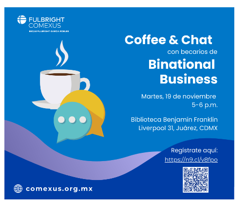 Únete a este evento presencial con personas becarias del programa Fulbright-García Robles Binational Business este martes 19 de noviembre, en la Biblioteca Benjamín Franklin, para escuchar cómo han aprovechado esta experiencia internacional. Regístrate y asegura tu lugar!