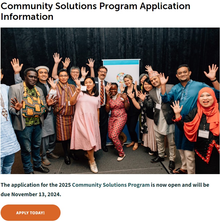 Invitación para participar en la convocatoria del Programa de Soluciones Comunitarias (CSP en inglés), auspiciado por el Departamento de Estado de los Estados Unidos e instrumentado por IREX. Este es un programa de liderazgo profesional de un año de duración para líderes comunitarios, de entre 26 y 39 años, que trabajan para mejorar sus comunidades abordando temas relacionados con la democracia y derechos humanos, el medio ambiente, la paz y resolución de conflictos, y derechos de las mujeres e igualdad de género.
