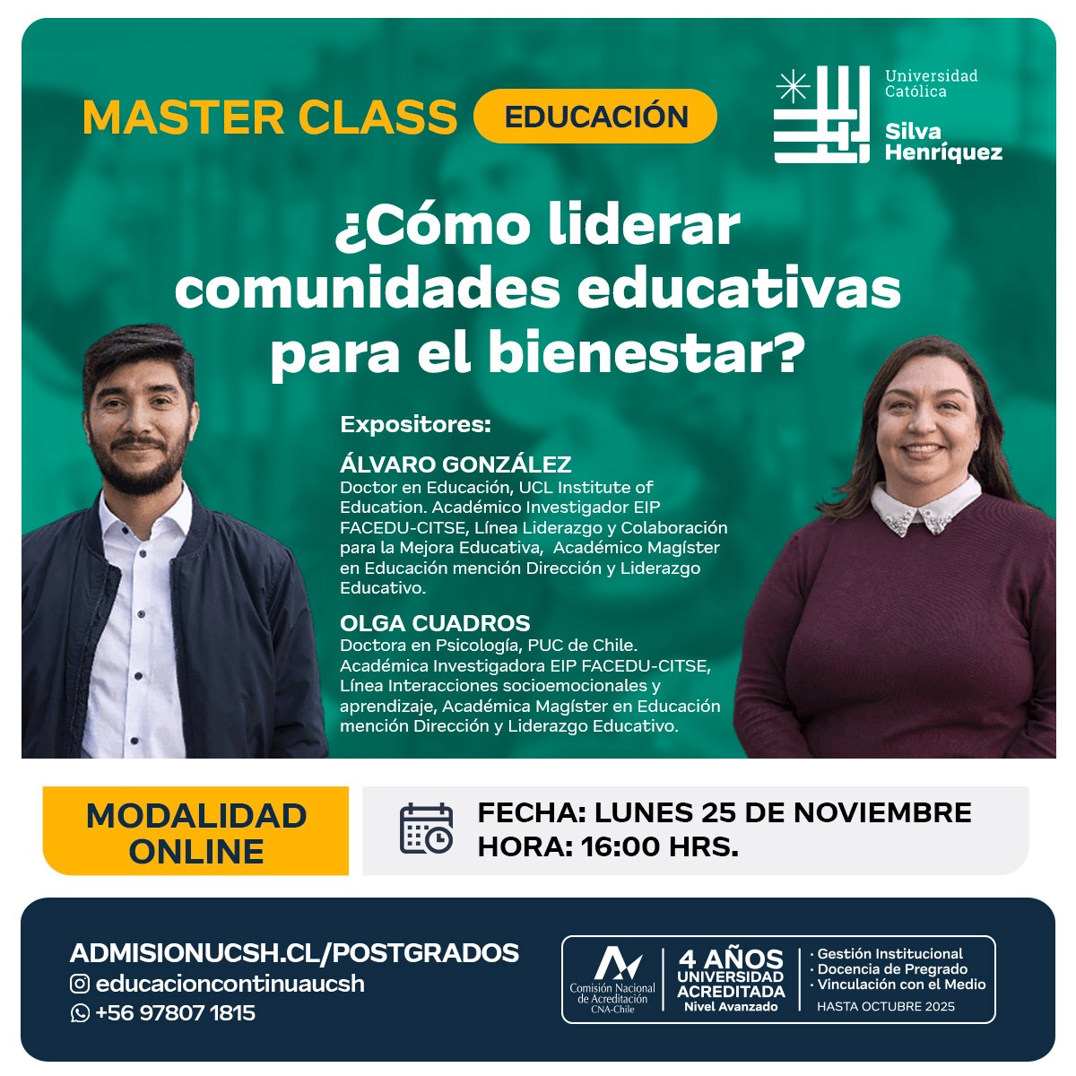 La Universidad Católica Silva Henríquez (UCSH), de Chile, te invita a esta Master Class que aborda los desafíos que enfrentan las comunidades educativas para crear ambientes de cuidado y desarrollo, describiendo estrategias y posibilidades desde el liderazgo educativo.
