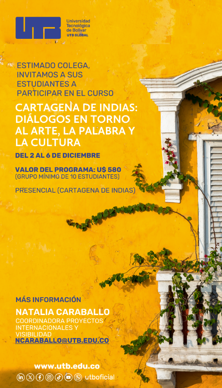 La Universidad Tecnológica de Bolívar (UTB), de Colombia, invita a participar en este que curso combina una agenda académica y cultural en la mágica ciudad de Cartagena de Indias.