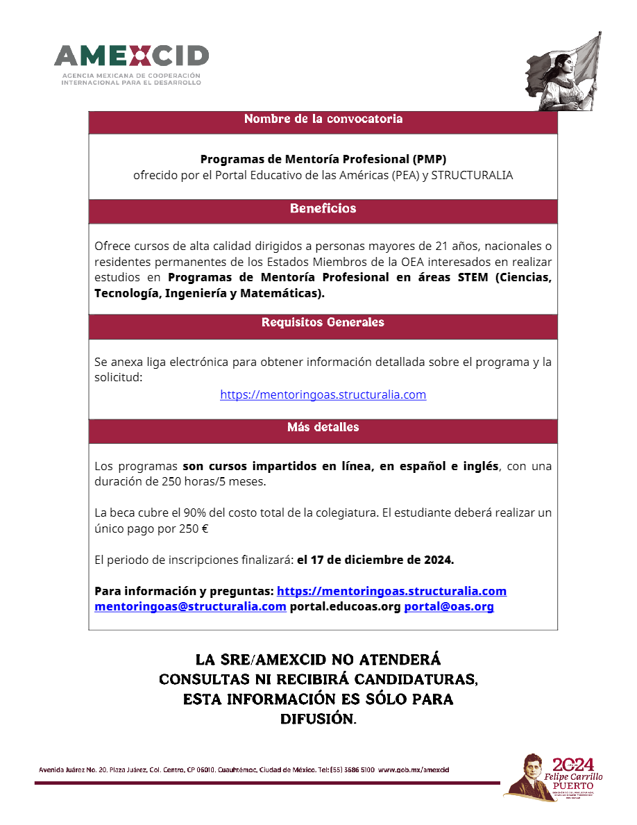 Periodo de inscripción: del 21 de octubre al 10 de diciembre de 2024, 23:59 hrs (hora CDMX)