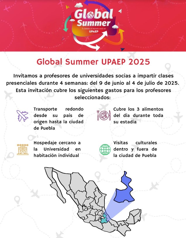 La Universidad Popular Autónoma del Estado de Puebla (UPAEP) invita a profesores de universidades social a impartir clases presenciales durante 4 semanas (del 9 de junio al 4 de julio de 2025).