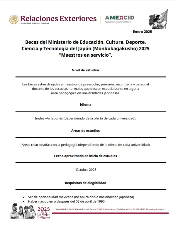 Las becas están dirigidas a maestros de preescolar, primaria, secundaria y personal docente de las escuelas normales que deseen especializarse en alguna área pedagógica en universidades japonesas.