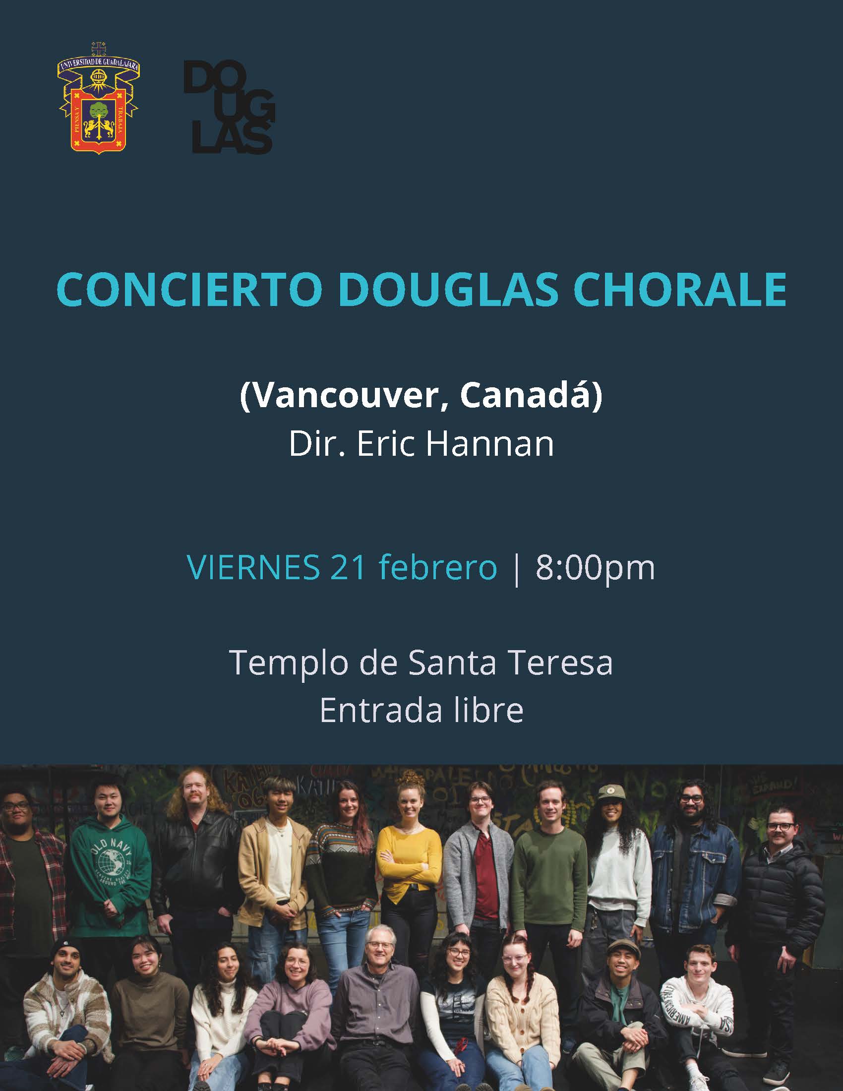 Recital de canto gratuito y abierto al público en el que participarán el Maestro Eric Hannan de Douglas College y estudiantes de la Academia Coral del Departamento de Música de la Universidad de Guadalajara.