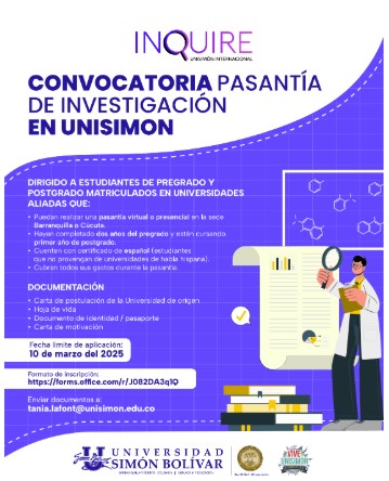 La Universidad Simón Bolívar (Unisimón), de Colombia, invita a estudiantes a postular a sus Pasantías de Investigación, una experiencia enriquecedora que les permitirá desarrollar habilidades en entornos de innovación y alto impacto.