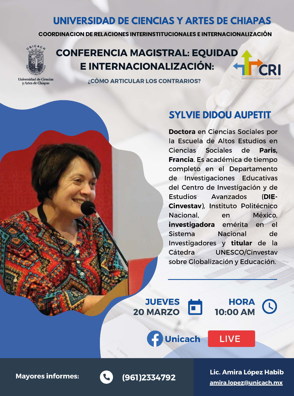 La Universidad de Ciencias y Artes de Chiapas (UNICACH), a través de la Coordinación de Relaciones Interinstitucionales, te invita a participar en esta Conferencia Magistral virtual que será impartida por la Dra. Sylvie Didou Aupetit, Investigadora Nacional Emérita por el Sistema Nacional de Investigadoras e Investigadores y Profesora Investigadora del CINVESTAV.
