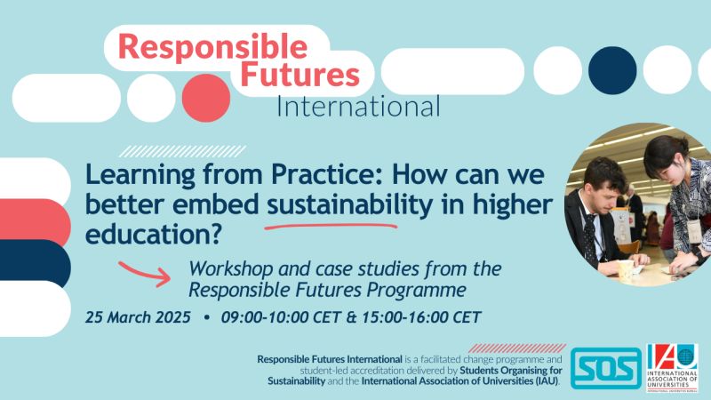 La Asociación Internacional de Universidades (IAU -por sus siglas en inglés-) y Estudiantes Organizados por la Sostenibilidad en el Reino Unido te invita a este taller interactivo para que aprender de los testimonios y casos prácticos del "Programa Futuros Responsables". Los talleres están dirigidos al personal docente y a los educadores que trabajan en la implementación de iniciativas de sostenibilidad o de los ODS en la educación superior y a través de la participación estudiantil.