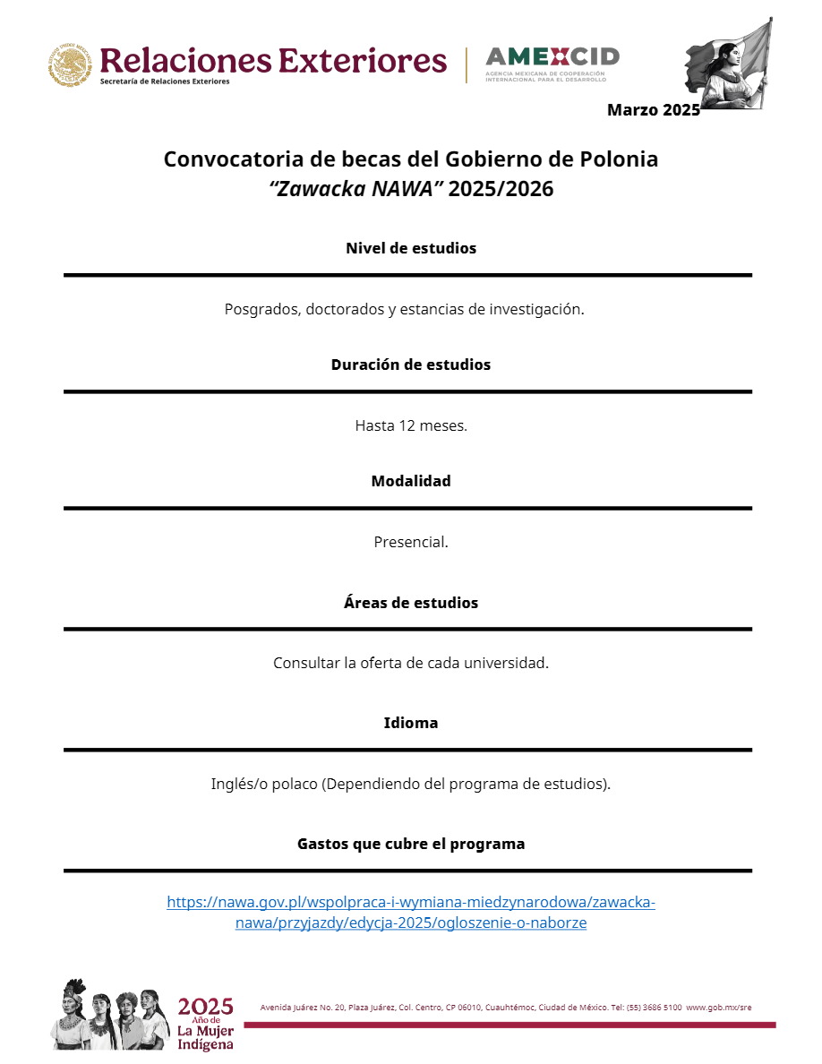 La beca Zawacka NAWA está destinada a estudiantes interesados en realizar estudios de posgrado, doctorado y estancias de investigación en diversas áreas académicas en Polonia.