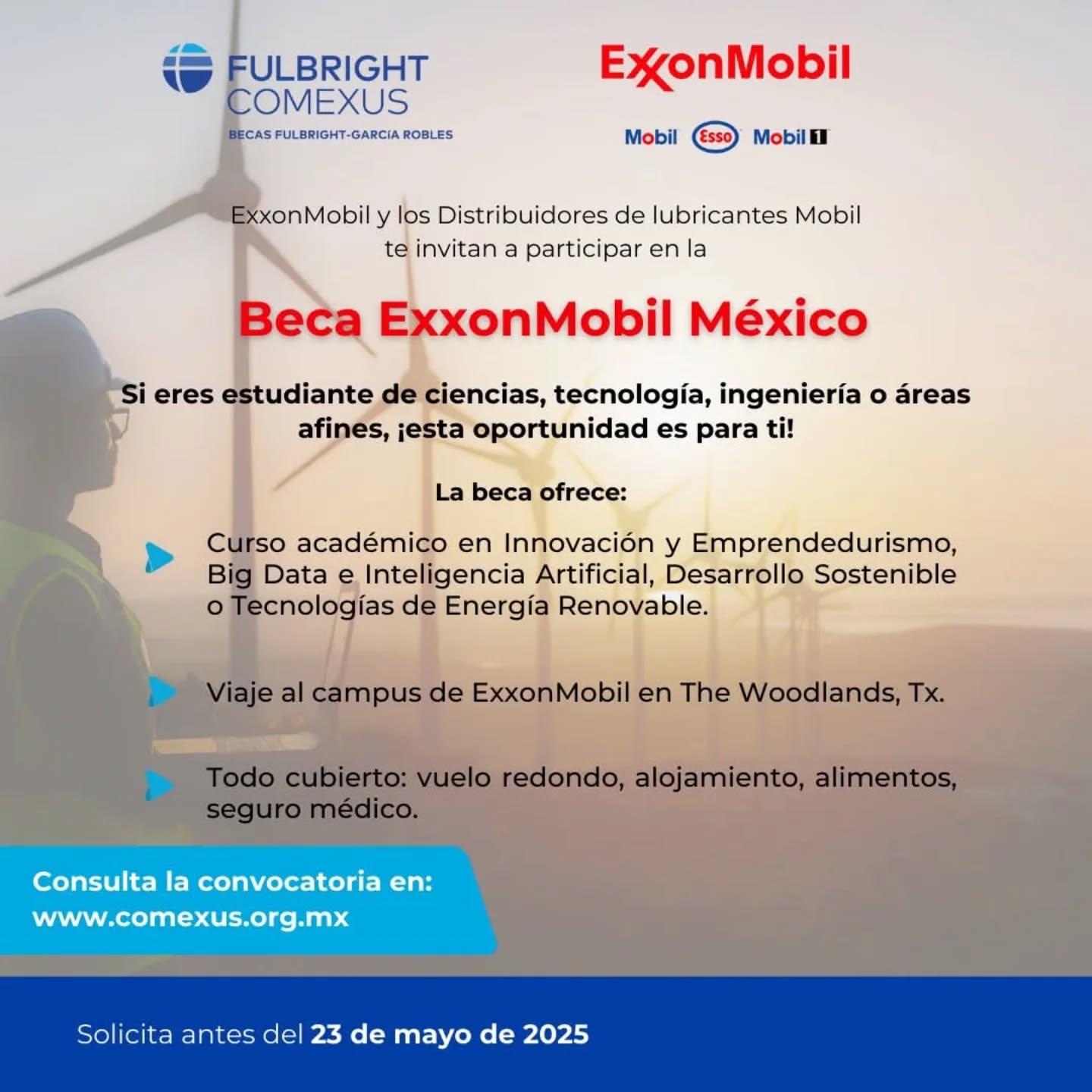 ¿Estudias ciencia, tecnología, ingeniería, sustentabilidad o innovación? ¡Esta es tu oportunidad para vivir una experiencia académica en Estados Unidos! La Beca ExxonMobil México ofrece apoyos de movilidad con todos los gastos pagados para estudiantes mexicanos.