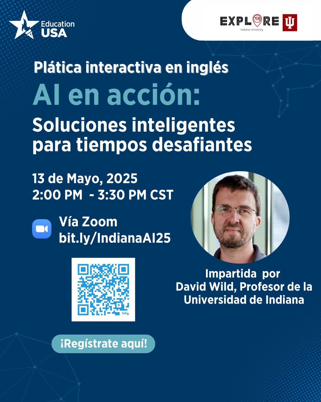 ¿Cómo puede la inteligencia artificial ayudarnos a enfrentar retos actuales y futuros? EducationUSA te invita a una "masterclass" con David Wild, profesor de Informática y Computación en la Universidad de Indiana, quien compartirá cómo la IA puede ser una herramienta útil en contextos de crisis y para mejorar la toma de decisiones.