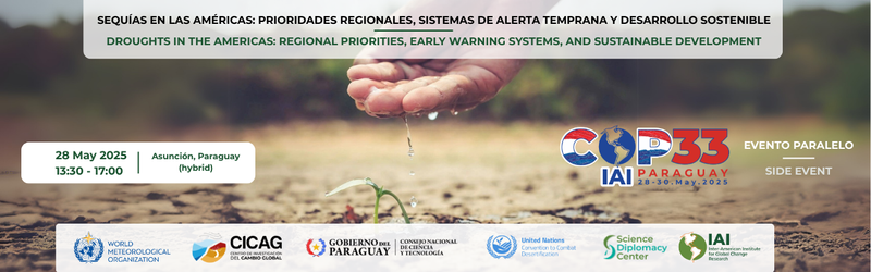 Invitación a participar en el evento paralelo de la COP33: Sequías en las Américas: prioridades regionales, sistemas de alerta temprana y desarrollo sostenible. La discusión abordará los desafíos que representan las sequías en las Américas, destacando prioridades regionales, sistemas de alerta temprana y estrategias para el desarrollo sostenible. Es una oportunidad para compartir experiencias, fortalecer la cooperación y promover respuestas informadas frente a un fenómeno climático cada vez más frecuente y severo.