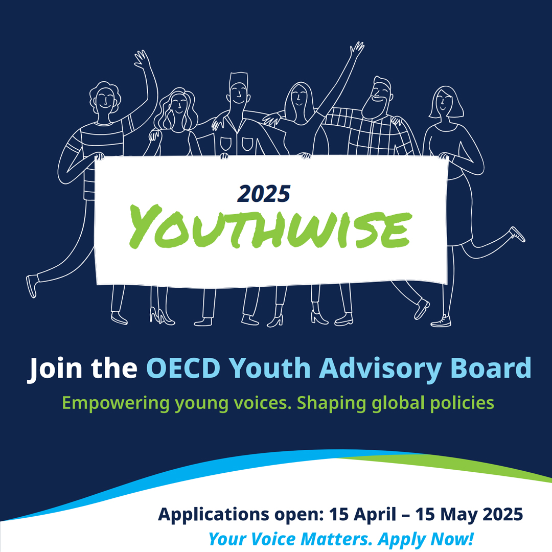 La Organización para la Cooperación y el Desarrollo Económicos (OCDE) invita a jóvenes entre 18 y 30 años a participar en este programa cuyo objetivo es formar una red de jóvenes comprometidos con la creación de políticas orientadas hacia un futuro global más sostenible y próspero. Esta red se centra en áreas clave como: i) Digitalización e Inteligencia Artificial; ii) Educación y Desarrollo de Habilidades; iii) Salud y Bienestar; iv) Medio Ambiente; v) Turismo Sostenible; y vi) Emprendimiento.