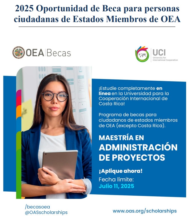 La Secretaría General de la Organización de los Estados Americanos (SG/OEA) y la Universidad para la Cooperación Internacional (UCI), de Costa Rica, ofrece becas para estudiar la Maestría en Administración de Proyectos, completamente en línea, a ciudadanos de estados miembros de la OEA.