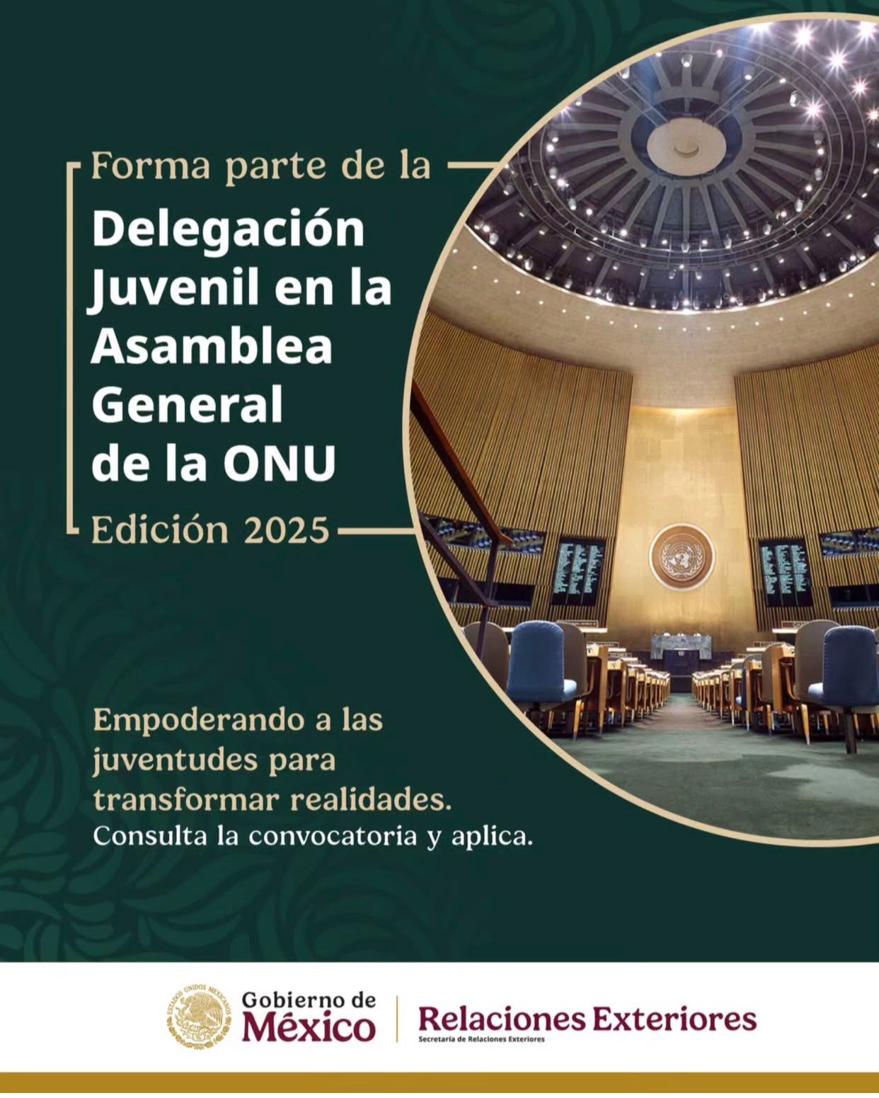Este programa representa una oportunidad única para que las juventudes mexicanas participen como integrantes de la Delegación de México ante la Asamblea General de las Naciones Unidas (AGONU), en su 80° Periodo de Sesiones. Se trata de una experiencia formativa de gran valor, con impacto significativo en el desarrollo personal, profesional y cívico de quienes participan. Se llevará a cabo en la ciudad de Nueva York del 27 de septiembre al 17 de octubre de 2025.