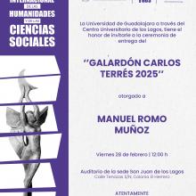 Finalmente, el 28 de febrero, en el auditorio del campus de San Juan de los Lagos, se entregará el Galardón Carlos Terrés a Manuel Romo Muñoz, fundador del grupo PROAN o Huevo San Juan, por su compromiso, altruismo y gestión empresarial por el desarrollo de la región y de la comunidad alteña.
