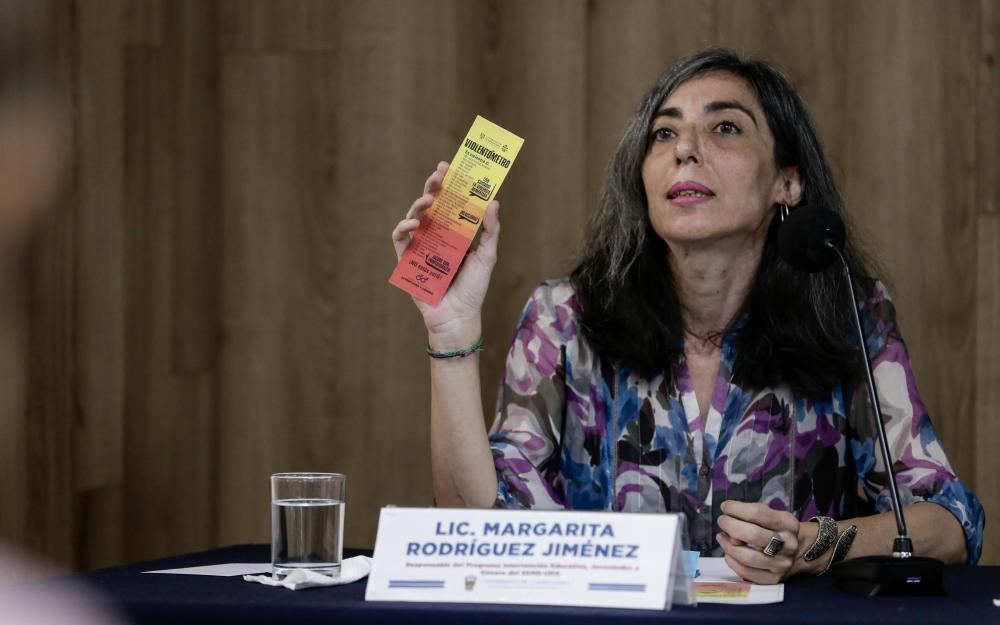 La responsable del Programa Intervención Educativa, Juventudes y Género del Sistema de Enseñanza Media Superior (SEMS), licenciada Margarita Rodríguez Jiménez, habló de la importancia del uso del Violentómetro, un material que busca sensibilizar y formar en la prevención de las violencias de género. Agradeció también la participación de los alumnos de 26 preparatorias metropolitanas y regionales, y de la Colectiva Hilos, quienes han creado una red de hilos rojos que simbolizan la sangre de las víctimas de violencia de género y feminicidios, misma que, al ser terminada, será colgada de la Biblioteca Pública del Estado de Jalisco Juan José Arreola.