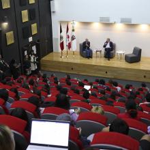 El auditorio José Cornejo Franco, de la Biblioteca Pública del Estado de Jalisco (BPEJ) Juan José Arreola, fue la sede del conversatorio entre el diplomático y los universitarios y donde el Vicerrector Ejecutivo de esta Casa de Estudio, doctor Héctor Raúl Solís Gadea, presentó al diplomático ante la comunidad.