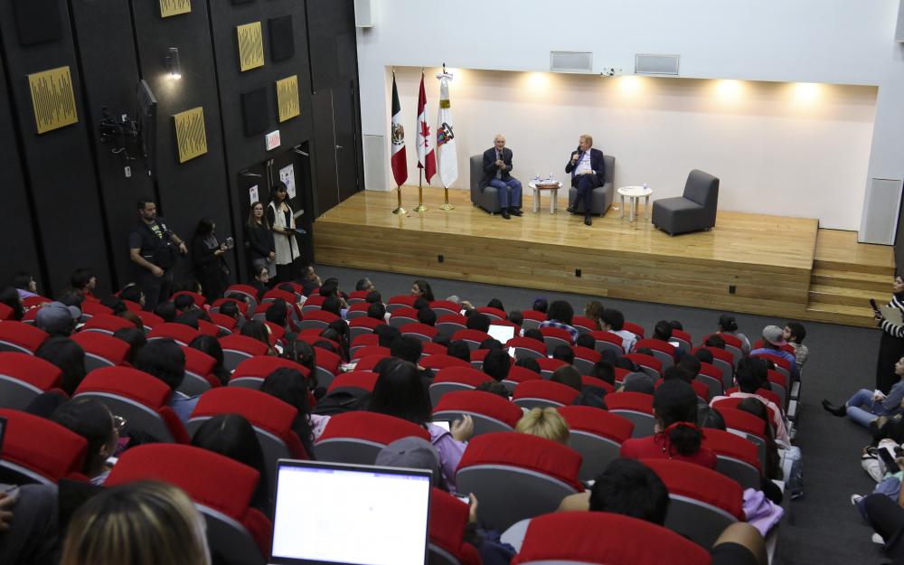 El Embajador de Canadá en México, Graeme C. Clark, intercambió ideas con estudiantes de licenciatura, maestría y doctorado de la UdeG sobre problemas bilaterales como la migración, el panorama político de Norteamérica y la urgencia de profundizar el intercambio cultural entre ambas naciones.