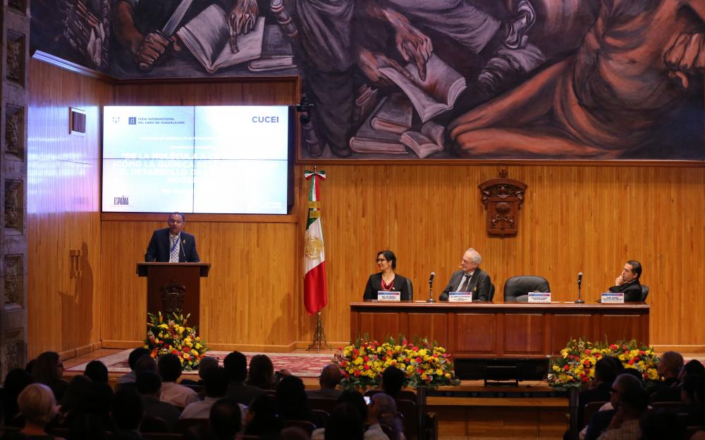 Como una de las actividades del Foro Ciencia UDG, el Centro Universitario de Ciencias Exactas e Ingenierías (CUCEI) y la 38 Feria Internacional del Libro de Guadalajara (FIL), se llevó a cabo la conferencia magistral “De la innovación científica a soluciones industriales: la química moderna y su impacto en el desarrollo de medicinas”, que impartió el Premio Nobel de Química 2022, doctor Morten Peter Meldal, en el Paraninfo Enrique Díaz de León.