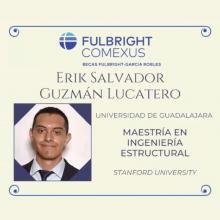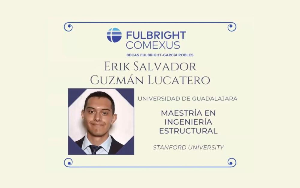 Erik Salvador Guzmán Lucatero es egresado de la Licenciatura en Ingeniería Civil del Centro Universitario de Ciencias Exactas e Ingenierías. Su sobresaliente trayectoria académica lo hizo merecedor del premio CENEVAL al desempeño de excelencia en el año 2018. Fue asistente de investigación en el Instituto de Ingeniería de la Universidad Nacional Autónoma de México (UNAM) y se desempeñó como profesor de la Lic. en Ingeniería Civil de esta Casa de Estudio. Su experiencia se expande también al sector privado, pues ha sido colaborador de una empresa dedicada a la innovación estructural. Es también autor y coautor de tres investigaciones relacionadas con la implementación de dispositivos de protección sísmica. A partir del mes de agosto, estudiará la Maestría en Ingeniería Estructural en la Stanford University.