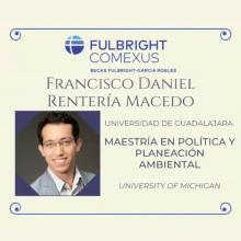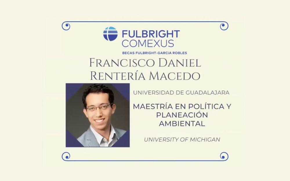 Por su parte, Francisco Daniel Rentería Macedo, quien cursará la Maestría en Política y Planeación Ambiental en la University of Michigan, es egresado de la Licenciatura en Ingeniería en Energía del Centro Universitario de Tonalá. A lo largo de su trayectoria como estudiante de licenciatura, participó en programas de internacionalización que lo llevaron a realizar estancias académicas en Global Ties U.S., en Pensilvania y Nueva York, en el Babson College, en Massachusetts y en la Universidad de Melbourne, Australia. En cuanto a su experiencia en la investigación, fue asistente en el Instituto de Energías Renovables de esta Casa de Estudio, en el Centro de Investigación Científica de Yucatán y en el Laboratorio de Innovación Energética de la Universidad de British Columbia, Canadá. Cuenta también con experiencias de voluntariado y ha recibido varios premios. Asimismo, colaboró en la Coordinación de Proyectos Estratégicos de la Secretaría de Medio Ambiente y Desarrollo Territorial de Jalisco.