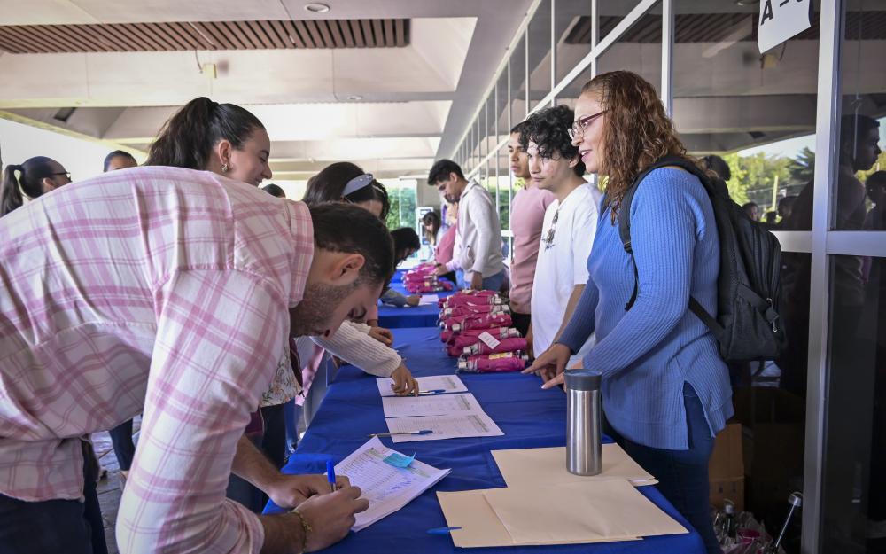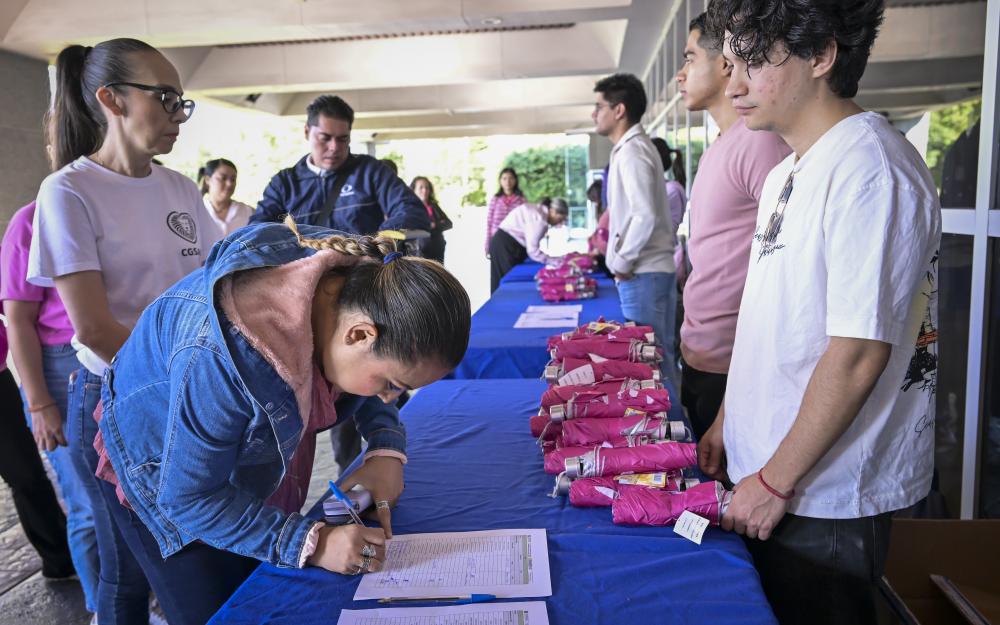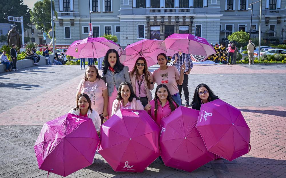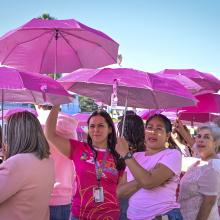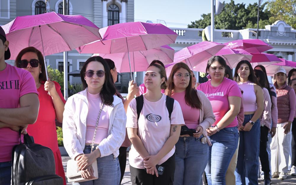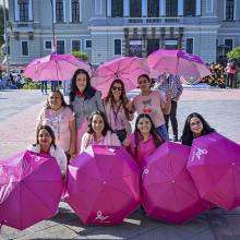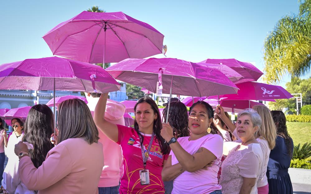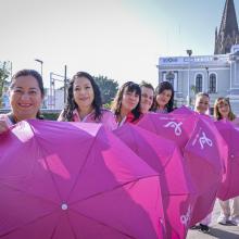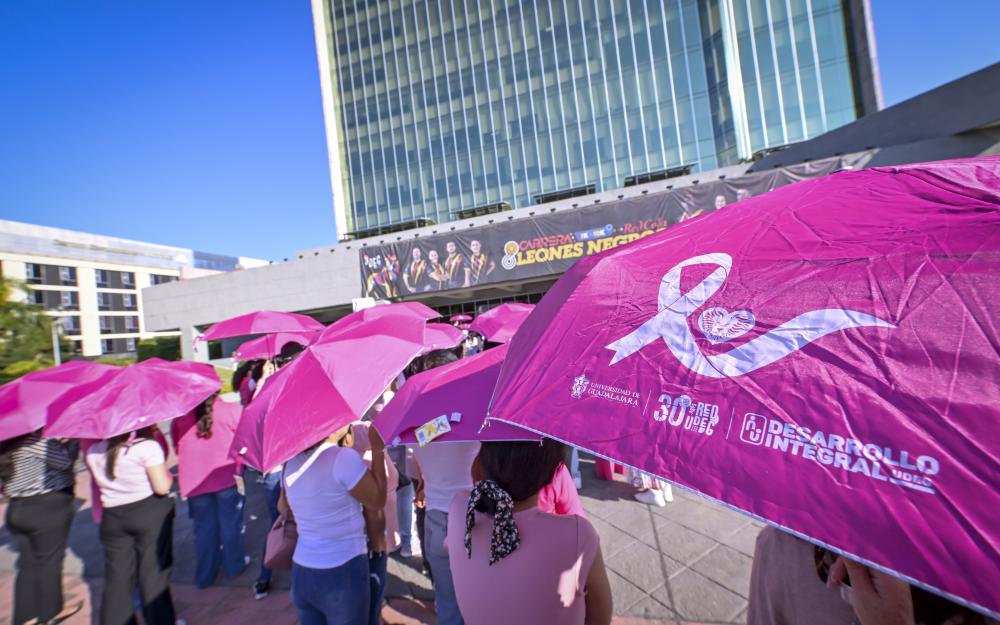 Aproximadamente 350 personas, entre personal académico y administrativo de esta Casa de Estudio, se reunieron en la explanada con un paraguas rosa en mano y configuraron un emblemático “lazo humano”, mismo que podía ser visualizado desde las alturas.